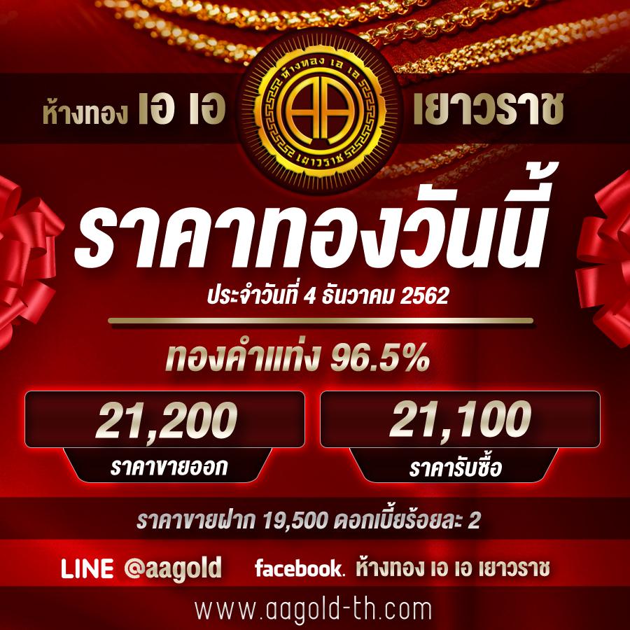 รายงานราคาทองคำวันนี้ ประจำวันพุธที่ 4 ธันวาคม พ.ศ. 2562 โดยห้างทอง เอ เอ เยาวราช ซึ่งอ้างอิงตามประกาศของสมาคมค้าทองคำ